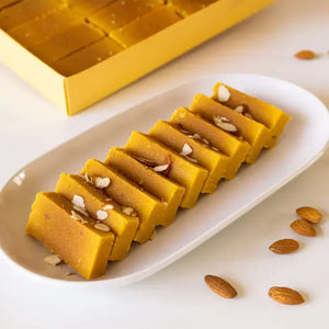 Badam Mysore Pak is a traditional Indian sweet that brings together the richness of roasted almonds with the melt-in-mouth texture of authentic Mysore Pak. This delightful confection combines ghee, gram flour, and finely ground almonds to create a luxurious treat that's perfect for celebrations, festivals, or whenever you crave something truly special. Each bite delivers a perfect balance of nutty flavors and buttery smoothness. Ideal for gifting or indulging yourself, this classic sweet captures the essence of South Indian confectionery craftsmanship.